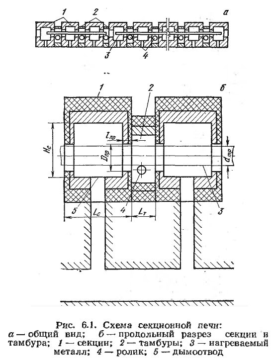 9. Температура подогрева воздуха tв =3700С 10. Коэффициент расхода воздуха αв =1,08 11. Тип горелок выбрать 12. Размеры рабочего пространства секции 12.1 длина Lc=1,5 м 12.2 диаметр Dc =1,0 м 13. Размеры рабочего пространства тамбура 13.1 длина Lт=0,5 м 13.2 диаметр Dт=0,5 м 14. Размеры проема между секцией и тамбуром 14.1 диаметр Dпр=0,3 м 14.2 толщина lпр = 0,2 м 15. Футеровка секции 15.1 материал шамотно-волокнистые плиты ШВП-350 15.2 толщина Sс=300 мм 16. Футеровка тамбура 16.1 материал муллитокремнеземистый войлок МКВР-200 16.2 толщина Sт=200 мм Краткое описание печи и ее схема. Секционные печи скоростного нагрева применяют для нагрева больших партий однородного сортамента трубной заготовки и труб диаметром до 200 мм и длиной не менее 2,5—3 м. Иногда в этих печах нагревают квадратную заготовку небольших размеров. Секционные печи состоят из установленных в одну линию отапливаемых камер. (секций) и расположенных между ними неотапливаемых тамбуров, в которых находятся транспортирующие ролики. Ролики косо расположены, что обеспечивает непрерывное вращение заготовки во время нагрева. Заготовки можно перемещать в печи в один, два или три ряда (ручья). Каждая секция имеет самостоятельное," отопление - и дымоотбор; несколько секций объединяют в общую систему регулирования (зону). Длина секции 1,5— 1,75 м, поперечные размеры на 0,4—0,6 м больше поперечных размеров нагреваемой заготовки; длина неотапливаемого тамбура 0,35—0,5 м.