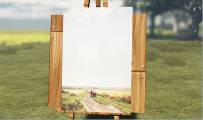 Картина выставлена на краю поля, на дальнем плане сосны.