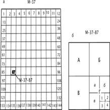 Рис. 4.2. Разграфка листов карт масштабов: а – 1:100000; б – 1:50000, 1:25000, 1:10000. Разграфка карт масштабов 1:50000, 1:25000 и 1:10000 формируется делением на четыре части листа более мелкого масштаба (соответственно - 1:100000, 1:50000, 1:25000) и добавлением к номенклатуре предыдущего масштаба соответствующего знака, как показано на рис. 4.2, б и в табл. 4.2.