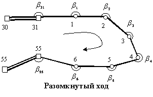 В теодолитных ходах измеряют левые и правые по ходу горизонтальные углы. В разомкнутом ходе (см. рисунок) 30, 31, 55, 56 – исходные пункты, 1 – 6 – пункты теодолитного хода. В замкнутом ходе 42 – 43 – исходные пункты. 1 – 8 - На практике во избежание путаницы измеряют левые горизонтальные углы. Методика измерений: