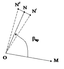 При построении угла с повышенной точностью (рис. 10.2) строят угол выше описанным способом. Угол b измеряют с установленной точностью. Вычисляют разность Db = bпр - bизм. Вычисляют расстояние NN0, на которое надо переместить по перпендикуляру точку N в ее проектное положение N0 по формуле