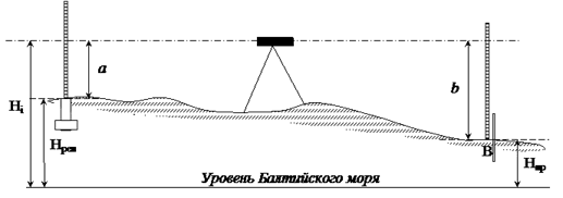 Рис. 10.2. Построение проектного горизонтального угла повышенной точности 3) Вынесение на местность точки с заданной проектной отметкой При строительстве зданий, дорог бровка земляного полотна, фундаменты мостов, трубы, цоколь здания и др. сооружения должны быть расположены на проектном горизонте. Проектный горизонт каждой части сооружений в процессе строительства определяют путем выноса проектной отметки на эту часть. Проектный горизонт Нпр т. В строят на местности с помощью нивелира и рейки (рис. 10.3). Посередине между репером с известной отметкой Нреп и т. В устанавливают нивелир. По рейке, стоящей на репере, производят отсчет а, вычисляют горизонт инструмента по формуле Нi = Нреп + а (10.4) и разность b = Нi - Нпр. (10.5) После этого в точке В устанавливают рейку так, чтобы по ней был отсчет b, при котором высота пятки рейки и будет равна проектной отметке. Под пяткой рейки, на забитом около нее коле, фиксируют положение искомой точки.