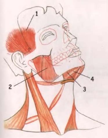 а)один корень б)два корня в)четыре корня г)три корня В) Структура содержания темы: Жевательные мышцы приводят в движение нижнюю челюсть, при сокращении этих мышц развивается определенной силы жевательное давление, что обеспечивает способность зубов откусывать и размалывать пищевой комок. Эти мышцы принимают участие также в акте глотания, речеобразования и др. Часть мышц относится к основным (главным) жевательным: жевательная мышца (m. masseter), височная мышца (t. temporalis), медиальная крыловидная мышца (t. pterygoideus medialis), латеральная крыловидная мышца (m. pterygoideus lateralis). К вспомогательным мышцам относятся: подбородочно-подъ-язычная мышца (m. geniohyoideus), челюстно-подъязычная мышца (m. mylohyoideus), переднее брюшко двубрюшной мышцы (venter anterior m. digastricus).