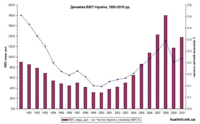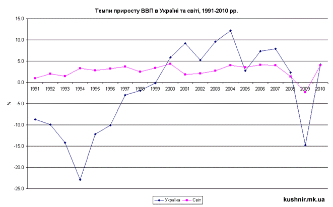 В процессе расширенного воспроизводства происходит сочетание интенсивного и экстенсивного типов экономического роста, и образуется смешанный (реальный) тип экономического роста. В нем различают преимущественно интенсивный или экстенсивный подтипы такого смешанного экономического роста. По темпам различают высокий и низкий темпы экономического роста. Но не всегда высокий темп является лучшим, потому что это может влиять на качество продукции и структуру производства, то есть значительно превышать количество выпуска средств производства над потребительскими товарами. Также экономический рост должен быть непрерывным и пропорциональным. Изменения реального ВВП в украинской экономике приведены в табл. 11.1. Мировая практика свидетельствует, что нормальные темпы экономического роста равняются 3-5% (табл. 11.1). Таблица 11.1. Динамика ВВП Украины, в % к предыдущему году