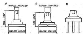 Вопрос 5.Элементы каркаса промышленного здания: фундаменты, фундаментные балки. Осн.видом фундаментов под сборные ж/б колонны пром.зданий явл-ся ж/б фундаменты стаканного типа (рис. 71). По способу устройства они могут быть сборными, монолитными или сборно-монолитными (рис. 71,а, б ). При недостаточно прочных грунтах фун-ты могут быть свайными (рис. 71,в).