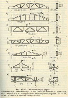 Для предотвращения стока гидроизоляционных мастик уклон рубероидных кровель рекомендуется ограничивать 8%. Этим определяется уклон верхнего пояса строп.балок. В безраскосных фермах с круговым очертанием 5%-ный уклон кровли обеспеч-ся выпущенными из верх. пояса «рожками». Строп.кон-и воспринимают равномерно распределенную нагрузку от массы покрытия и снежного покрова (550—850 кг/м2) и сосредоточ.нагрузку от фонарных ферм и подвесных кранов. Опорное давление, передаваемое ими на подстроп.конст-и, колеб-ся в пределах 50—150т. Подстроп. фермы, примыкающие к торцовым стенам и деформационным швам, несколько укорачиваются соответственно шагу колонн. Для всех строп.ферм одного пролета приняты одинаковые размеры внешн. контура, что позволяет изготовлять их в единой опалубной форме со сменными вкладышами. Верхн.пояс ферм очерчен по окружности. Высота опорных узлов 0,9 м (1,5 модуля).. До уровня крыши они надстраиваются стальными надопорными стойками. Очертание подстроп.ферм трапецеидальное, с одним или двумя «окнами» для установки строп.ферм соответственно при шаге колонн 12 или 18 м. Подстроп.фермы для шага 18 м в наст.время прим-ся в экспериментальном порядке. Высота опорных узлов подстропильных ферм 0,6 м (1 модуль).