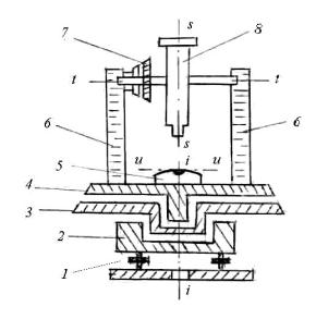 Принципиальная схема устройства теодолита показана на рис. 7.3. В отверстие подставки 2, опирающейся на три подъёмных винта 1, входит ось вращения лимба 3, в которую в свою очередь входит ось алидады 4.