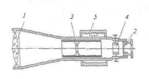 Оптическая система трубы (рис. 7.4.) состоит из объектива 1, окуляра 2 и фокусирующей линзы 3, которую с помощью специального устройства - кремальеры 5, перемещают вдоль геометрической оси трубы. Между фокусирующей линзой и окуляром помещена сетка нитей 4 – деталь, несущая стеклянную пластину с нанесёнными на нее вертикальными и горизонтальными штрихами. При измерении углов перекрестие штрихов – центр сетки нитей, наводят на изображение визирной цели. Сетка нитей имеет четыре исправительных винта, позволяющих перемещать ее в горизонтальном и вертикальном направлениях. Линия, проходящая через оптический центр объектива и перекрестие сетки нитей, называется визирной осью. Увеличением трубы называется отношение угла, под которым изображение предмета видно в трубе, к углу, под которым предмет виден невооружённым глазом. Практически увеличение трубы равно отношению фокусного расстояния объектива к фокусному расстоянию окуляра. Трубы геодезических приборов имеют увеличение от 15´ до 50´ и более. Полем зрения трубы называется пространство, видимое в трубу при её неподвижном положении. Обычно оно бывает от 1 до 2º. Визированием называют наведение трубы на цель. Точность визирования зависит от увеличения трубы и приближенно равна