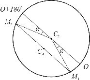 Рис. 7.5. Поле зрения отсчётных микроскопов: а - штрихового (отсчёт по горизонтальному кругу 159º46’, по вертикальному 350º48’); б - шкалового (отсчёт по горизонтальному кругу 295º36’, по вертикальному -4º47’); в - оптического микрометра (отсчет 145º23’14’’). Шкаловый микроскоп имеет две шкалы, совмещённые с лимбами вертикального и горизонтального кругов (рис. 7.5, б). Отсчёты берут по градусным штрихам лимбов. Шкала вертикального круга теодолита 2Т30 имеет два ряда подписей. Если перед градусным делением отсутствует знак, отсчёт делают так же, как и по горизонтальному кругу. Если перед цифрой градусов стоит минус, то минуты считывают по шкале от -0 до -6 (справа налево). Точные теодолиты снабжены микроскопами с оптическим микрометром (рис. 7.5, в). Градусы отсчитывают по основной шкале после совмещения верхнего и нижнего изображений штрихов горизонтального (или вертикального) круга, а минуты и секунды читают по шкале микрометра. Эксцентриситет алидады. Несовпадение оси вращения алидады CA (рис. 7.6) с центром лимба CL называется эксцентриситетом алидады и является причиной систематических погрешностей при измерении углов. Так, при повороте алидады на угол b (рис. 7.6 а) вместо верной разности отсчетов по лимбу О2 – О1 из-за эксцентриситета алидады будет получена разность M2 – M1. При отсутствии эксцентриситета поворот алидады на 180° (см. рис. 7.6 б) вызывает изменение отсчета на 180°. А при наличии эксцентриситета отсчеты до и после поворота различаются не ровно на 180°, так как содержат одинаковые погрешности эксцентриситета e, но с разным знаком. Так на рис. 7.6 б отсчет M1 больше верного отсчета O на угол e, а отсчет M2 меньше верного отсчета на угол e.