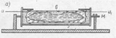 Цилиндрический уровень (рис. 7.7.) состоит из стеклянной ампулы, верхняя внутренняя поверхность которой отшлифована по дуге окружности определённого радиуса. При изготовлении уровня её заполняют горячим эфиром или спиртом и запаивают. При охлаждении в ампуле образуется небольшое пространство, заполненное парами жидкости и называемое пузырьком уровня. Ампула помещается в металлическую оправу, снабжённую исправительными винтами для регулировки положения уровня (на рис. 7.7, а - винт М). На внешней поверхности ампулы нанесена шкала со штрихами через 2 мм. Точка в середине шкалы называется нульпунктом уровня. Касательная к внутренней поверхности ампулы в нульпункте называется осью уровня. Пузырёк уровня занимает в ампуле наивысшее положение, поэтому, когда его концы расположены симметрично относительно нульпункта, ось уровня горизонтальна. Центральный угол t (рис. 7.7, б), соответствующий одному делению шкалы, называется ценой деления уровня. Цена деления уровня, выраженная в секундах, определяется по формуле