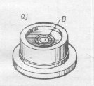 где l - длина деления шкалы; R - радиус внутренней поверхности ампулы; ρ - число секунд в радиане. В разных типах теодолита цена деления цилиндрического уровня бывает от 15² до 60². У круглого уровня (рис. 7.8.) внутренняя поверхность верхней стеклянной части ампулы имеет сферическую поверхность. Шкала уровня имеет вид окружностей с общим центром, который служит нульпунктом.