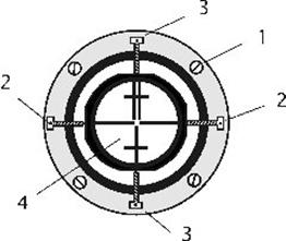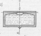 Рис. 7.8. Круглый уровень: а – вид сверху; б –разрез и ось уровня Нормаль к внутренней сферической поверхности ампулы в нульпункте называется осью круглого уровня. При расположении пузырька уровня в нульпункте ось уровня занимает отвесное положение. Цена деления круглого уровня бывает в пределах 3 - 15’. Круглые уровни служат для предварительной установки прибора в рабочее положение.