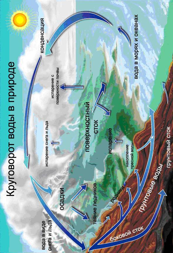 Круговорот воды – это непрерывное перемещение больших масс воды на земном шаре между геосферами (гидросферой, атмосферой и земной поверхностью), обусловленный солнечной энергией, действием силы тяжести и геологическими процессами. В процессе кругооборота вода испаряется с поверхности океана и суши, водяные пары перемещаются вместе с воздушными течениями, конденсируются, и вода возвращается в виде атмосферных осадков на поверхность суши и моря. Атмосферные осадки, попадая на земную поверхность, частично вновь испаряются, частично образуют временные и постоянные водостоки и водоемы, частично – просачиваются в землю и образуют подземные воды. Различают несколько видов круговоротов воды в природе: · большой, или мировой, круговорот – водяной пар, образовавшейся над поверхностью океанов, переносится ветрами на материки, выпадает там в виде атмосферных осадков и возвращается в океан в виде стока. В этом процессе изменяется качество воды: при испарении соленая морская вода превращается в пресную, а загрязненная – очищается; · океанический круговорот – водяной пар, образовавшийся над поверхностью океана, конденсируется и выпадает в виде осадков снова в океан; · внутриконтинентальный круговорот – вода, которая испарилась над поверхностью суши, опять выпадают на сушу в виде атмосферных осадков. В конце концов, осадки в процессе движения опять достигают Мирового океана. Моря теряют из-за испарения больше воды, чем получают с осадками, на суше – положение обратное. Всего с поверхности океана испаряется за год 425 тыс. км3 воды, а с поверхности суши – 71 тыс. км3. На поверхность океана выпадает 385 тыс. км3, а на сушу 111 тыс. км3. В итоге получаем, что всего испаряется (с поверхности океана и суши) 425 + 71 = 496 тыс. км3. Выпадает в виде осадков на поверхность океана и сушу 385 + 111 = 496 тыс. км3. Видим, на сушу выпадает осадков больше (111 тыс. км3), чем с нее испаряется (71 тыс. км3). Разница 111 – 71 = 40 тыс. км3 стекает в океан с суши по рекам. Так как в атмосфере в любой момент времени находится около 13 тыс. км3 воды в виде пара, получается, что за год совершается примерно 38 круговоротов (496: 13).