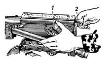 Мал. 8. Відокремлення затвора із зворотними пружинами від ствольної коробки: 1 – затвор; 2 – зворотні пружини. Від’єднати спускову планку від ствольної коробки, для чого сполучити отвір на планці з шипом на лівій внутрішній стінці ствольної коробки та від’єднати планку.