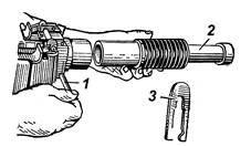 Мал. 11. Відокремлення ствола від ствольної коробки: 1 – замикач стволу; 2 – ствол; 3 – засувка замикача стволу
