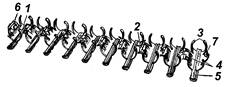 Мал. 35. Стрічка для пострілів: 1 – ланка стрічки; 2 – шплінт; 3 – захвати передні; 4 – захвати задні; 5 – хвостовик;