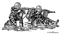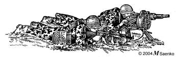 Навідник головного гранатомета визначається по вісі іншого гранатомета (мал. 48) та доповідає, наприклад: «По другому – сорок чотири п’ятдесят». Після цього встановлює початковий кутомір. Командир відділення, прийнявши оцінку головного гранатомета, змінює її на 30-00 і командує, наприклад: «Другому, кутомір чотирнадцять п’ятдесят, наводити в головний». Навідник другого гранатомета встановлює вказаний кутомір, наводить свій гранатомет у віху (ліхтар) головного гранатомета, після чого відзначається по раніше зазначеній точці наведення і доповідає командиру відділення оцінку по точці наведення. Віхи знімаються по закінченні наведення (оцінки) по них. Для побудови паралельного віяла по віддаленій точці наведення, розташованій на фланзі вогневої позиції, командир відділення після наведення гранатомета в зазначеному направлення подає команду головному гранатомету відзначитися по віддаленій точці наведення й отриману оцінку командує як кутомір для іншого гранатомета. 101. Для визначення найменших прицілів командир відділення визначає відстань до гребеня укриття (наприклад, 100 м до чагарнику), додає до нього 200 м (на розсіювання гранат), переводить отриманий результат (300 м) по таблиці стрільби в поділках прицілу (0-41) і записує даний приціл. Після цього командує: «Першому, приціл 0, наводити у верхній зріз чагарнику вперед». По цій команді навідник гранатомета встановлює приціл на 0 і за допомогою механізмів наведення наводить верхній кутник сітки прицілу в найвищу точку укриття; обертаючи барабанчик прицілу, виводить пухирець подовжнього рівня на середину, при цьому пухирець поперечного рівня також повинен бути на середині; читає установку прицілу, наприклад 0-76, та доповідає її командиру відділення. Командир відділення додає до установки прицілу, повідомленої навідником, записаний приціл і отриманий у сумі найменший приціл (0-41 + 0-76 = 1-17), що відповідає дальності стрільби, приблизно 700 м, записує в бланк запису стрільби. У такому порядку визначається найменший приціл вправо і вліво від головного направлення стрільби по найвищих точках укриття. Найменші приціли можуть бути також визначені по таблиці, зазначеній в додатку 13. Date: 2015-09-19; view: 535; Нарушение авторских прав |