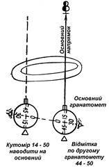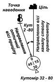 - піднощик розташовується, як правило, праворуч та позаду у 2 – 3 м від помічника навідника в готовності подати помічнику навідника магазин-коробку з пострілами та прийняти від нього стрічку та порожню магазин-коробку, а також приймає положення, зручне для стрільби з автомата. Командир відділення розташовується поблизу гранатометів на місці, що забезпечує кращі умови для спостереження за ціллю та результатами стрільби а також гарну чутність обслугами команд, які подаються ним. При боковому вітрі він розташовується з навітряної сторони. 95. При стрільбі з закритої вогневої позиції та на навчальних заняттях команда для підготовки до стрільби може подаватися роздільно, наприклад: «Гранатомети на вогневій позиції – встановити!» і потім «Заряджай!». 96. По команді «Гранатомети на вогневій позиції – встановити!» виконуються ті ж дії, що і по команді «До бою!», за винятком заряджання гранатомета, а саме: - навідник приєднує тіло гранатомета до станка і переводить рукоятки в бойове положення; приєднує приціл до гранатомета і встановлює кутомір 30-00, приціл 0-00; наводить гранатомет у зазначеному направлення, виводить пухирці поперечного і подовжнього рівнів на середину; закріплює затискачі механізмів горизонтального і вертикального наведення; приймає необхідне положення для стрільби з гранатомета та доповідає, наприклад: «Такий-то гранатомет встановлений!»; - помічник навідника встановлює станок у зазначеному напрямку, допомагає навіднику в приєднанні тіла гранатомета до станка; надає гранатомету необхідну висоту лінії вогню і закріплює затискачі ніг; відкриває кришку магазин-коробки з пострілами та приєднує її до гранатомета; приймає положення з правого боку від гранатомета, зручне для заряджання гранатомета та стрільби з автомата. Командир відділення та піднощик діють так само, як і по команді «До бою». 97. По команді «Заряджай»: - помічник навідника відкриває приймач; виймає з коробки початок стрічки та вкладає першу (порожню) ланку над вхідним вікном ствольної коробки таким чином, щоб хвостовик наступної ланки з пострілом лежав на клинах зйомників; закриває кришку магазин-коробки та приймач; - навідник за рукоятку перезарядження відводить затвор до відмови назад та різко відпускає рукоятку; ставить гранатомет на запобіжник, якщо не планується негайне відкриття вогню. 98. При підготовці до стрільби з закритої вогневої позиції після установки гранатометів необхідно навести головний (звичайно правофланговий) гранатомет в головному (зазначеному) направлення; побудувати паралельне віяло, тобто надати в горизонтальній площині стволу іншого гранатомета напрямок, паралельний стволу головного гранатомета; визначити найменші приціли, тобто установки прицілу, що відповідають найменшій дальності стрільби, при яких гранати не будуть потрапляти за гребінь укриття, що знаходиться перед вогневою позицією. При стрільбі навісною траєкторією найменші приціли не визначаються, однак треба стежити, щоб віддалення вогневої позиції від укриття було в два і більш разів більше висоти укриття. Наприклад, при висоті укриття 5 м віддалення вогневої позиції повинне бути не менш 10 м. 99. Головний напрямок стрільби вказується по місцевих предметах (орієнтирах), видимих з вогневої позиції. Якщо місцевий предмет не видно з вогневої позиції, головний 
