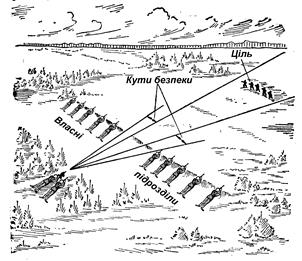 Мал. 55. Кути безпеки при стрільбі в проміжках своїх підрозділів