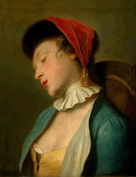 В 1750-е годы разнообразил стиль рококо в русской живописи итальянский мастер Пьетро Ротари (1707-1762). Знатный веронец, носивший титул графа, прибыл в Петербург в 1756 году. Он привез с собой и затем написал уже в России огромное количество так называемых «головок». Этот тип небольшой картинки с оплечным или погрудным изображением юных дев, зрелых дам и молодых людей чрезвычайно был популярен в Европе и понравился при российском дворе. «Головки» кисти Ротари воплощали идеал женственности и молодости, фации, чувственной привлекательности – все то, что так ценилось изощренным вкусом рококо. Его героини и герои, занятые рукоделием, чтением потаенных писем или кормлением птичек, а то и просто спящие, все равно привлекают внимание зрителя, заставляют его любоваться их разнообразием и красотой. Их позы, игривые взгляды, жесты пухлых ручек с изящно оттопыренными пальчиками подчинены правилам и этикету театральной игры рококо. Любовь к переодеваниям сказывается в значительном разнообразии национальных костюмов, в том числе и русских.