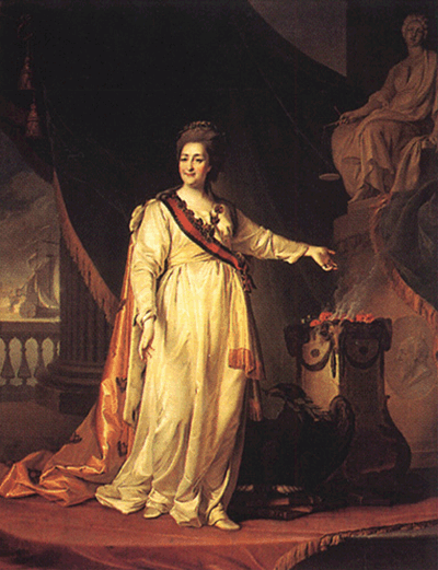 Классическим примером стиля классицизма в портретном жанре служит знаменитый «Портрет Екатерины II – законодательницы в храме богини Правосудия» (1783, ГРМ) кисти Д.Г. Левицкого.