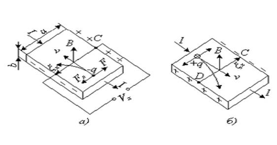 Рис. 111 Пояснення ефекту Холла на пластинах n-типу (а) і p-типу (б). Як показує досвід, при не дуже сильних полях Vxвиявляється пропорційна індукції поля В, силі струму I і обернено пропорційна товщині пластини b: