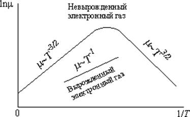 Рис. 3. Залежність рухливості носіїв заряду від температури На рис.3 наведено приклад температурної залежності рухливості носіїв заряду в напівпровіднику. Величина рухливості залежить від механізмів розсіювання носіїв заряду. В області високих температур, коли амплітуда коливань вузлів кристалічної решітки велика, відбувається розсіяння носіїв заряду на фононах. Рухливість носіїв заряду пропорційна T-3/2 і T-1 відповідно для напівпровідників, містять не вироджений і вироджений електронний газ. При низьких температурах розсіювання носіїв заряду відбувається на іонізованих домішках. Цей механізм розсіювання носіїв заряду полягає в наступному: рухомі електрони або притягуються до атома домішки, або відштовхуються від нього завдяки кулонівською силам, чинним між зарядженими частинками, в залежності від знаку заряду домішки. В результаті, при розсіюванні на іонізованих домішках змінюється за напрямком швидкість руху електронів. Для напівпровідників, містять не вироджений електронний газ, рухливість носіїв заряду пропорційна T-3/2. Рухливість носіїв заряду для випадку виродженого електронного газу не залежить від температури. Якщо величина рухливості носіїв заряду визначається декількома механізмами розсіювання, то домінуючий механізм визначається зі співвідношення