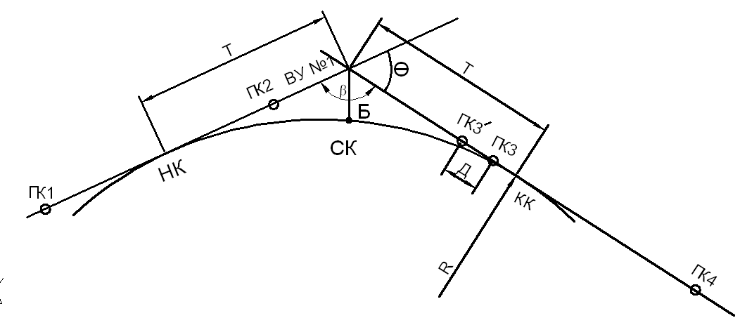 Перед початку польових робіт розраховують такі елементи кривої (див. рис. 2.1); Т – тангенс, К – довжина кривої, Б – бісектриса, Д – домір – це довжина на яку необхідно перенести кожний послідовний пікет за вершиною кута повороту, в зв`язку з тим, що довжина кривої завжди менше сумарної довжини ламаної лінії. Розрахунок елементів ведуть за такими виразами;