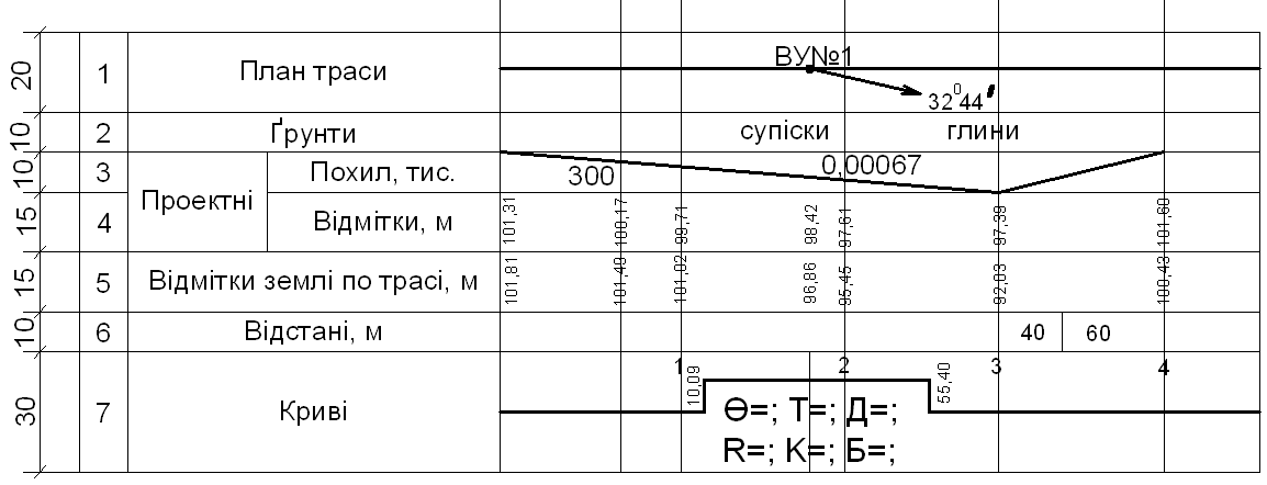 Заповнення профільної сітки починають з графи 6 куди заносять відстань в цілих метрах між пікетами і плюсовими точками в горизонтальному масштабі побудови. В графу 5 напроти відповідних перпендикулярів з польового журналу нівелювання виписують відмітки землі вздовж осі траси, що округлені до 0,01 м. В графі 1 за даними пікетажного журналу будують план траси у вигляді прямої лінії з вказівкою вершин кутів повороту траси, направленням та чисельним значенням кутів повороту. Тут також вказують ситуацію. В графі 2 указують ґрунти вздовж осі траси. В графі 7 будують криві, відкладаючи у масштабі побудови пікетні позначення початку і кінця кривих. ПК НК = ПК ВУ – Т, (2.6) ПК КК = ПК ВУ + Т. (2.7) Знайдені значення НК и КК відкладають у графі 7, опускаючи перпендикуляр під відповідним пікетом довжиною 15 мм. Криву зображують умовним знаком висотою 5 мм: опуклістю доверху, коли кут повороту правий; опуклістю донизу, коли кут повороту лівий. У середині або біля умовного позначення виписують значення елементів кривої. Вище лінії УГ на відповідних перпендикулярах відкладають у вертикальному масштабі побудови відрізки, які дорівнюють різниці фактичних відміток землі і відмітки лінії УГ. З’єднують знайдені точки прямими лініями і отримують профіль. Поперечний профіль будують по лінії поперечника в одному масштабі.