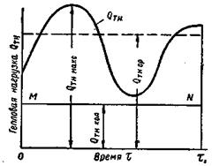 Под тепловым режимом печей понимается изменение тепловых нагрузок (Qтн. вт) во времени Qтн.= f(τ). Графическое изображение теплового режима — тепловая диаграмма (рис. 5) в практику расчетов по печной теплотехнике была введена впервые И. Д. Семикиным [17] применительно к мартеновским печам. Тепловая нагрузка равняется произведению часового расхода топлива (В, кг/час, м3/час) на его теплоту сгорания ( Полный расход тепла на тепловую обработку материала, очевидно, будет равен