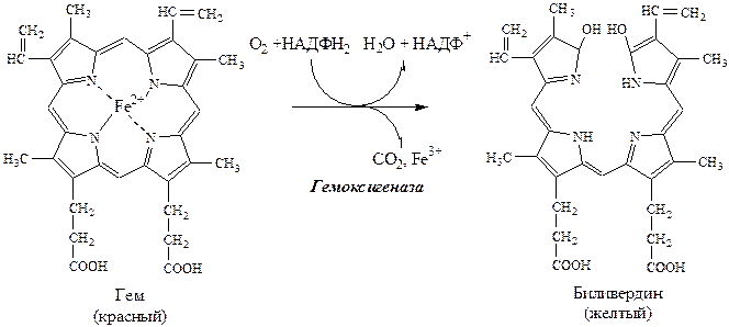 1. Гем индуцирует синтез гемоксигеназы. Гемоксигеназа, локализованная на мембране ЭПР, расщепляет связь между двумя пиррольными кольцами гема, в результате образуется биливердин. Освободившееся железо связывается ферретином и снова используется организмом.