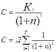 где С – текущая стоимость, т. е. оценка величины Д с позиции текущего момента, руб.; Д – доход, планируемый к получению в году t, руб.; n – коэффициент дисконтирования (т. е. стоимость капитала, норма доходности, процентная (учетная ставка), доли единицы; Т – общее число лет; t – фактор времени (число лет или количество оборотов капитала);