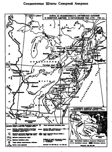 Американские колонии Англии. Первая английская колония на Атлантическом побережье Северной Америки была основана в начале XVII в. В последующее время (XVI—XVIII вв.), было создано еще 12 колоний, вытянувшихся вдоль средней части побережья Северной Америки. Колонисты захватывали земли индейцев, которых оттесняли в глубь материка или беспощадно уничтожали. В колониях использовался труд рабов-африканцев, насильственно вывезенных с их родины. Рабство особенно широко было распространено в южной группе колоний, где выращивались сахарный тростник, хлопок, табак. Иной характер приобретала экономика северной группы колоний, так называемой Новой Англии, где начали развиваться фермерские хозяйства, мануфактуры. Несколько колоний, оказавшихся между Севером и Югом, в социально-экономическом плане заняли промежуточное положение. Направления развития экономики северных и южных колоний во многом определялись неодинаковым составом господствующих слоев населения. На Юге доминировали плантаторы-рабовладельцы — потомки английской аристократии. Многие из них переселились в Америку во время английской революции. На Севере руководящее положение занимали купцы, мануфактуристы, а основную часть населения составляли фермеры и ремесленники. Немалое их число покинуло Англию в послереволюционный период, спасаясь от гонений реставраторов монархии. К 70-м годам XVIII в. население колоний достигло 3,5 млн. человек, включая 500 тыс. рабов. Политика Великобритании в отношении ее американских колоний. Неодинаковым было управление в колониях. Некоторые из них считались частными владениями (Пенсильвания, Мэриленд), были колонии с «народным управлением» (Коннектикут, Род-Айленд), а также «королевские колонии», где управление осуществлялось губернаторами, назначавшимися правительством метрополии. Но почти во всех колониях действовали выборные законодательные собрания, составленные из представителей наиболее состоятельных слоев населения. Колонисты считали себя свободными подданными английской короны, на которых распространялось действие права метрополии: Великой хартии вольностей, Билля о правах, «общего права», «права справедливости» и т. д. Жалованные колониям королевские хартии, казалось, подтверждают это. Однако правительство рассматривало колонии как сырьевой придаток метрополии и рынок сбыта английских товаров и проводило политику ограбления колоний, сдерживания их промышленного развития. Противоречия между метрополией и ее американскими колониями достигли особой остроты к середине XVIII в. Революционная Война за независимость. Декларация независимости. Начались открытые массовые антиправительственные выступления американцев. Для координации борьбы были созданы специальные органы — «комитеты корреспонденции, безопасности, наблюдения». В 1774 г. вгороде Филадельфия прошел Первый континентальный конгресс представителей колоний в составе 55 делегатов. Он утвердил Декларацию прав, которая выражала протест против таможенной и налоговой политики метрополии. Одновременно была составлена петиция к королю, где в самой почтительной форме колонисты просили прекратить притеснения и не давать повода к окончательному разрыву с короной. В ответ английское правительство начало военные действия. Тогда вмае 1775 г. собрался Второй континентальный 
