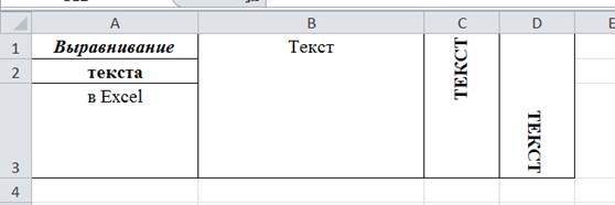 Методические указания. Введите необходимый текст в нескольких ячейках, предварительно объединив ячейки B1:B3, C1:C3, D1:D3, и расположите его различными способами в различных форматах. Для объединения ячеек используйте закладку Главная-Выравнивание-Объединить и поместить в центре Для изменения направления текста в ячейках нужно выбрать в контекстном меню Формат ячеек - Выравнивание /Ориентация. Для форматирования текста и задания границ используйте значки панели Главная-Шрифт – Границы или закладки Шрифт и Границы в Формате ячейки.