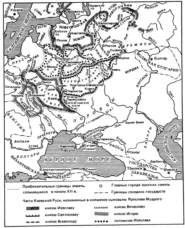 В поисках союзников. Всеволод, ставший великим князем, на короткое время объединил под своей властью большую часть Руси, посадив сыновей в удельных городах. Византийские симпатии Всеволода угасали, и это неудивительно. Во второй половине XI в. Византия почти потеряла Малую Ази., хозяйство империи было разрушено бездарным правлением императрицы Зои и внутренней смутой, устроенной Романом Диогеном в 1068— 1071 гг. Относительный порядок в Византии начал устанавливаться лишь после 1081 г., когда василевсом стал Алексей Комнин; а до того киевский князь просто не мог рассчитывать на поддержку слабеющей византийской державы. В поисках союзника Всеволод, как и его старший брат, начал обращать взоры на Запад, но Западная Европа тогда являла собой неутешительную картину. «Христианский мир» переживал пассионарную депрессию акматической фазы. Пассионарность западноевропейцев активно смещалась к границам суперэтнического ареала. Германские феодалы начали захватывать пограничные славянские земли и превращать славян в бесправных «сервов» — крепостных. Западные славяне, жившие по Эльбе, сопротивлялись немецкому давлению всеми силами, но силы были неравны. Ужас положения славян состоял в том, что, не принадлежа к «Христианскому миру», они были для немцев не просто «чужими»: людей другого суперэтноса завоеватели рассматривали лишь как часть природы покоренной страны (со всеми вытекающими отсюда последствиями). Разумеется, и собственных крестьян немецкие бароны притесняли достаточно сильно. Но характер этого притеснения был иной. Когда, к примеру, саксонский герцог, став императором Священной Римской империи, наказывал «своих» саксов, то в них он видел людей, от которых просто требовал некоторой повинности. С бургундами, франконцами, баварцами герцог обходился уже гораздо более жестоко, а со славянами (или арабами, или венграми) поступал абсолютно бесчеловечно. Кроме того, все феодалы средневековой Европы делились на две основные партии. Одну партию возглавляла церковь, сама претендовавшая на десятину и на верховный авторитет в делах управления. Сторонники этой партии в XII—XIII вв. получили итальянское название гвельфы, по имени Вельфов — герцогов Саксонии и Баварии, боровшихся против императорской династии Гогенштауфенов. Приверженцы же императоров звались гибеллинами. Формально и те и другие считали себя католиками, а фактическое отношение к религии никого не волновало. Различие гвельфов и гибеллинов заключалось не в религиозных воззрениях — различались их программы устройства жизни. Гвельфы, естественно, опирались на авторитет римской курии и священников; гибеллины формировали свой «интеллектуальный фонд» из юристов (прежде цсего Болонского университета), которые обосновывали тезис о превосходстве власти императора над властью папы. Разным было также мироощущение гвельфов и гибеллинов, выражавшееся в их отношении к природе. Дело в том, что ряды гвельфов пополнялись людьми, жившими на своих природных землях и приспособившимися к вмещающему ландшафту. Поэтому к родной природе они относились вполне благожелательно. Большинство же гибеллинов состояло из весьма пассионарных феодалов, искавших славы, побед, завоеваний в далеких землях, где они жили за счет покоренного населения. И люди и природа оставались для них «чужими», а 