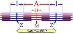 Актиновые нити крепятся на Z‑мембране, миозиновые – на М‑мембране. Участок между миофибриллы между Z‑мембранами называется саркомером (рис. 210211130). Саркомер принято считать структурно-функциональной единицей (СФЕ) миофибриллы скелетных и сердечных миоцитов.