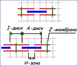 Тёмная полоска носит название А-диска, светлая - I‑диска. А-диск в центре более светлый и эта область называется Н-полоской. Края А-диска более тёмные называются S-зоной.