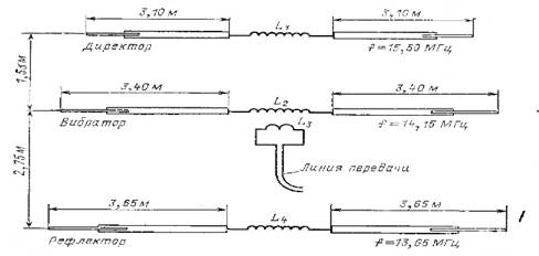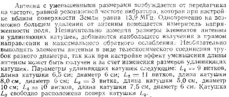 Незначительно изменяя размеры элементов антенны и удлиняющих катушек, добиваются наибольшего излучения в прямом направлении и максимального обратного ослабления. Необязательно выполнять элементы антенны в виде телескопического соединения трубок разного диаметра, так как при настройке эффект уменьшения длины антенны может быть получен и за счет изменения размеров удлиняющих катушек. Параметры удлиняющих катушек следующие: L1=9 витков, длина катушки 6,5 см, диаметр 6 см; L2=11 витков, длина катушки 8 см, диаметр 6см; L3=3 витка, длина катушки 5 см, диаметр 10см; L4=10 витков,длина катушки 7,5 см, диаметр 6 см.Катушка L3свободно расположена поверх катушки L2.