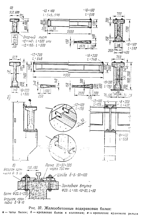 Подкрановые балки с уложенными по ним рельсами образуют пути движения мостовых кранов и, прочно соединяясь с колоннами, придают каркасу дополнительную пространственную жесткость. Железобетонные подкрановые балки рекомендуется применять под мостовые краны грузоподъемностью до 30 Т среднего и легкого режима работы при шаге колонн 6 и 12 м. При шаге колонн 6 м железобетонные балки по сравнению с неразрезными стальными дают небольшую экономию стали (около 20% —с учетом рельсов и их креплений), но значительно повышают сметную стоимость и приведенные затраты. К тому же, объем применения этих балок невелик. Поэтому подкрановые балки пролетом 6 м целесообразно выполнять из стали. С возрастанием пролета балок и грузоподъемности опорных кранов эффективность железобетонных подкрановых балок несколько повышается. Так, при шаге колонн 12 м железобетонные подкрановые балки по сравнению со стальными позволяют снизить расход стали до 50%, а по приведенным затратам они дороже стальных лишь на 10— 15%. Таким образом, железобетонные подкрановые балки эффективнее стальных при шаге колонн 12 м. Железобетонные подкрановые балки имеют тавровое и двутавровое сечение с утолщением стенок на опорах. Унифицированные размеры балок принимают в зависимости от шага колонн и грузоподъемности кранов. При шаге колонн 6 м такие балки имеют длину 5950 мм, высоту сечения 800, 1000 и 1200 мм, ширину полки 550, 600 и 700 мм, при шаге колонн 12 м — длину 11950 м, высоту 1400, 1600 и 2000 мм, ширину полки 650 и 750 мм (рис. 37, а). Развитая в ширину полка балок обеспечивает усиление сжатой зоны и восприятие поперечных горизонтальных крановых нагрузок, а также упрощает крепление крановых рельсов. Изготовляют подкрановые балки из бетона марок 300, 400 и 500, армирование в них принято преднапряженное. В балках предусмотрены закладные элементы для крепления к колоннам (стальные листы) и для крепления к ним крановых рельсов (трубки диаметром 20—25 мм через 750 мм по длине полки). Крепят подкрановые балки к колоннам сваркой закладных элементов и анкерными болтами (рис. 37, б). Болтовые соединения после окончательной выверки балок заваривают. Перепад балок по высоте в стыках допускается не более 2 мм. Рельсы к подкрановым балкам крепят стальными парными лапками, располагаемыми через 750 мм. В целях снижения шума при движении крана, уменьшения динамических воздействий на балки и повышения долговечности крановых путей под рельсы и лапки укладывают упругие прокладки из прорезиненной ткани толщиной 8—10 мм (рис. 37, в). Во избежание ударов мостовых кранов о торцовые стены здания на концах подкрановых путей устраивают стальные упоры, снабженные буфером из деревянного бруса.