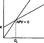 °к 171 - 104,89 2,5У* Перейдем к финансовому методу, который, повторяем, в отличие от бухгалтерского учитывает размер капитальных вложений, осуществленных для реализации проекта, и поток чистых поступлений (доходов) без учета амортизационных отчислений. Поток платежей в случае, когда удельные характеристики постоянны, отражается следующим рядом: ~K,(p-c)Q-f9(p-c)Q -/..., где К — размер инвестиций. Современная стоимость такого потока представляет собой чистый приведенный доход (NPV) — важный показатель, с которым имеют дело в анализе производственных инвестиций (см. гл. 12). В принятых здесь обозначениях и с привязкой чистых поступлений к середине соответствующих периодов можно записать: NPV= -* + [(р - с)0 -/]*„.. (1 + О05. По определению в барьерной точке NPV= 0. Отсюда