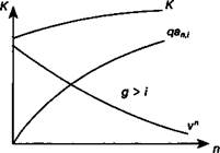 к Рис. 11.3 Перейдем к влиянию срока облигации. С увеличением срока величина первого слагаемого курса падает, второго растет при всех прочих равных условиях. Суммарный результат зависит от того, в каком соотношении находятся норма купонного дохода и рыночная ставка процента (см. рис. 11.4). На этом рисунке показано, что при g > i сокращение первого слагаемого перекрывается ростом второго. При равенстве нормы купонного дохода рыночной ставке изменения слагаемых курса полностью компенсируют друг друга.