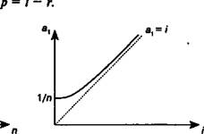 можно рассматривать как управляющие параметры, поскольку, изменяя их размер, достигают необходимого компромисса, удовлетворяющего участвующие стороны. В связи со сказанным, проследим влияние указанных параметров на величину коэффициента рассрочки. Очевидно, что с увеличением срока коэффициент рассрочки уменьшается. В пределе при п -*» получим ах = /(см. рис. 13.3). Как видим, увеличение срока лизинга заметно сказывается в начале шкалы сроков и уменьшается при больших сроках. Сказанное иллюстрируется следующими данными, подсчитанными для / = 5%: