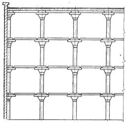 Рис. 86. Многоэтажное промышленное здание со сборными безбалочными перекрытиями. Основные несущие элементы безбалочного перекрытия — это колонны с капителями, на которые опираются многопустотные надколонные панели толщиной 30 см. На надколонные панели в свою очередь опираются пролетные панели перекрытия толщиной 16 см. Капители имеют форму усеченной пирамиды с квадратным основанием и с отверстием посередине, через которое проходит колонна. Капитель выполняет роль обоймы стаканного типа, которая охватывает верхушку колонны, опирается на консоли колонны и скрепляется с ними путем приварки закладных деталей. Поэтажный стык колонн осуществляется в пределах капители. Сборные безбалочные перекрытия сложны в монтаже и неэкономичны по расходу бетона и стали, поэтому применяются редко. Более экономичными являются сборно-монолитные безбалочные перекрытия, которые устроены следующим образом: плоская железобетонная плита с отверстием посередине для пропуска колонны служит капителью; на капители опираются межколонные предварительно напряженные многопустотные панели, на которые в свою очередь опираются пролетные панели (рис. 87).
