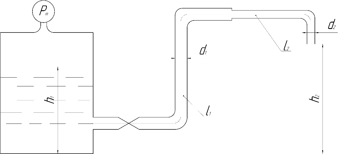 Жидкость из бака по трубопроводу вытекает в атмосферу (рис.1). Определить расход воды при заданных условиях. Труба - стальная сварная умеренно заржавленная. Жидкость - нефть легкая. Манометрическое давление Рм = 0,33 МПа, Высота жидкости в баке h1 = 2,5 м, Высота выхода из трубопровода h2 = 1,5 м, Длина первого участка трубопровода l1 = 15 м, Длина второго участка трубопровода l2 = 5,8 м, Диаметр первого участка трубопровода d1 = 0,15 м, Диаметр второго участка трубопровода d2 = 0,12 м, Коэффициент сопротивления вентиля ξвт = 2,1, Коэффициент сопротивления колена ζ к = 0,3, Плотность нефти ρ = 880 кг/м3, Кинематическая вязкость нефти ν = 2,5 х 10-5м2/с, Шероховатость труб ∆ = 0,6 мм