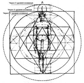 Согласно теории Люси, числа 18, 19 и 21 напрямую связаны с представлением египтян о трех уровнях сознания. Восемнадцать символизирует аборигенов, и древние египтяне полагали, что люди тех времен не имели верхней части черепа. Очевидно, череп был скошен назад. Перейдя на второй уровень, мы «добавили» к черепу верх, а когда мы физически продвинемся на третий уровень, что произойдет вот-вот, мы отрастим огромный череп, который дойдет до точки отношения круга к квадрату в пропорции фи - до 21. Если вы нарисуете круг в пропорции фи к квадрату, как показано в точке А, он достигнет точного центра 21-й линии. Поэтому, по мнению Люси, каждый из уровней сознания действительно заключен в геометрии этого рисунка.