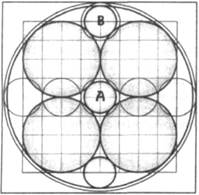 | Рис. 9-37. Канон Леонардо с квадратом и кругом внутри. Малый затемненный круг над головой центрирован на внешней поверхности блестящей оболочки, которая характеризуется золотой пропорцией круга для квадрата