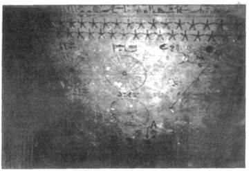 Теперь, уяснив себе, как работает эта новая сеть, давайте посмотрим, что представляют собой колеса, найденные на потолке египетских гробниц. О них мы говорили в главе 2 (с. 58 и 59, т. 1). Вот две из этих фотографий (рис. 10-34а, б) и их упрощенная схема (рис. 10-34с). Никто не знает, что это такое. Возможно, внимательно читая дальше, вы получите один из ответов (см. текст на с. 293). Сначала взгляните на прекрасную геометрическую гармонию рисунка 10-35, полученного путем совмещения круговой сети рисунка 10-32 с Цветком Жизни. С каким совершенством течет эта новая сеть! Как она утверждает свой источник - Цветок Жизни!