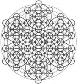Затем Тот велел мне продолжать в том же духе. Радиус меньшего круга на рисунке 10-32 я принял за диаметр ряда еще меньших кругов и разрисовал их по всей странице. Вы начинаете видеть пока еще что-то непонятное, но похоже, что Плод Жизни голографичен. Другими словами, вы видите 13 кругов, соединенных с 13-ю кругами, с 13-ю кругами, с 13-ю кругами и так далее — повсюду маленькие Плоды Жизни, гармонично и совершенно расположенные на странице. Если мы еще раз нарисуем серии по семь более мелких кругов, применяя пропорцию диа-метр-как-радиус, то получим сеть из кругов, показанную на рисунке 10-33. Я намеренно не разрисовал сеть по всему узору, чтобы вы не упустили сам образ. Он все время повторяется: 13 кругов, соединенных с 13 кругами, и так далее. Если вы будете рисовать так дальше, то сеть будет продолжаться без конца, но вовнутрь, в так называемой геометрической прогрессии, совершенно гармоничная и полностью голографичная в каждом фрагменте. Вы можете без конца идти вовнутрь, бесконечно идти вовне, потому что круг, описывающий весь рисунок, будет просто центральным кругом еще более крупной сети. Эта геометрическая прогрессия подобна пропорции Золотого сечения - у нее нет начала и нет конца. А когда у вас ситуация без начала и без конца, вы смотрите на что-то поистине изначальное. Именно такое понимание позво-лило сделать некоторые научные открытия, такие, как теория создания безграничного банка памяти компьютера, который с точки зрения традиционного математического мышления считался невозможным. Рис 10-32. Еще на один радиус внутрь, Рис. 10-33. Еще на один радиус внутрь