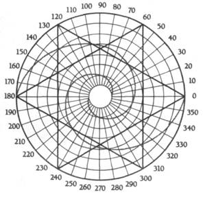 Рис. 10-34с. Упрощенная схема колес А теперь посмотрите, как гармонично с этой сетью двигается звезда в звезде Плода Жизни (рис. 10-36). На рисунке 10-366 я повернул звезду в звезде и всю сеть на 30 градусов. Вы видите звездный тетраэдр, вписанный в сферу, лежащим на ребре. Рисунок 10-37 — полярная сеть из 8-й главы. Почувствуйте или увидьте, как два внутренних образа Плода Жизни могут налагаться и при этом быть гармоничными. Побочное замечание: эти два рисунка, будучи совмещенными, частично становятся видом сверху вашего личного энергетического поля с поперечником около 18 м (55 футов), или 9 м (27 футов) от вашего центра до окружности. Такую геометрию вы имеете вокруг себя. Если вы внимательно посмотрите на эти рисунки, то увидите, что все они могут быть совмещены, последовательно наложены один на другой.