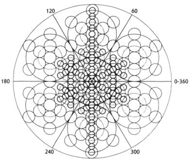 Круг М и 24 радиальные линии создают образ, идентичный колесам на потолке египетских гробниц (рис. 10-39), показанных здесь еще раз. Помните, почти в самом начале книги вы уже видели такие колеса? Они были среди первых фотографий, показанных мной (с. 58, т. 1). Я представил их в качестве доказательства того, что египтяне понимали информацию, содержащуюся в Цветке Жизни, и это была не просто какая-то маленькая забавная картинка на потолке гробницы. Сейчас я хочу показать вам чем, по-моему, являются эти колеса, по крайней мере, с точки зрения правого полушария, чтобы вы смогли понять образ мышления древних египтян. Я тщательно обмерил каждую часть колес. Если вы измерите диаметр маленькой втулки в середине и составите по одной линии круги того же размера от центра до края колеса, получится точ- но девять диаметров. Они показывают, что пропорции между маленьким кругом в центре, внешним кругом и 24 спицами идентичны двум предыдущим образам (рис. 10-37 и 10-38). Стрелка А (рис. 10-34а и более четко она видна на 10-34с) указывает на яйцо метаморфоза над головами фигур, совершающих 90-градусный поворот, и показывает этапы воскрешения, на основании, по-моему, вышеизложенной геометрии. Колеса - это ключи. Они отображают пропорции, точно указывающие расположение уровня измерения, на который ушли древние египтяне. На потолках гробниц они оставили нам карту. Вы заметите, что каждое колесо повернуто по-разному (рис. 10-39): спицы на одном колесе не всегда располагаются на одной линии со спицами другого колеса. Кажется, что спицы колес В и С точно на одной линии, а у колес А и В и В и D они смещены относительно центра. Все спицы слегка наклонены под разными углами. Я уверен, они указывают уровень измерения или мир, в который ушли древние египтяне. Не имеет значения, как вы на это смотрите; чем бы ни были египетские колеса, тот факт, что наши предки нарисовали их на стенах, означает лишь одно — они понимали более глубокую геометрию Цветка Жизни. Требовалось огромное знание, чтобы дойти до таких рисунков. Это не могло быть случайностью.